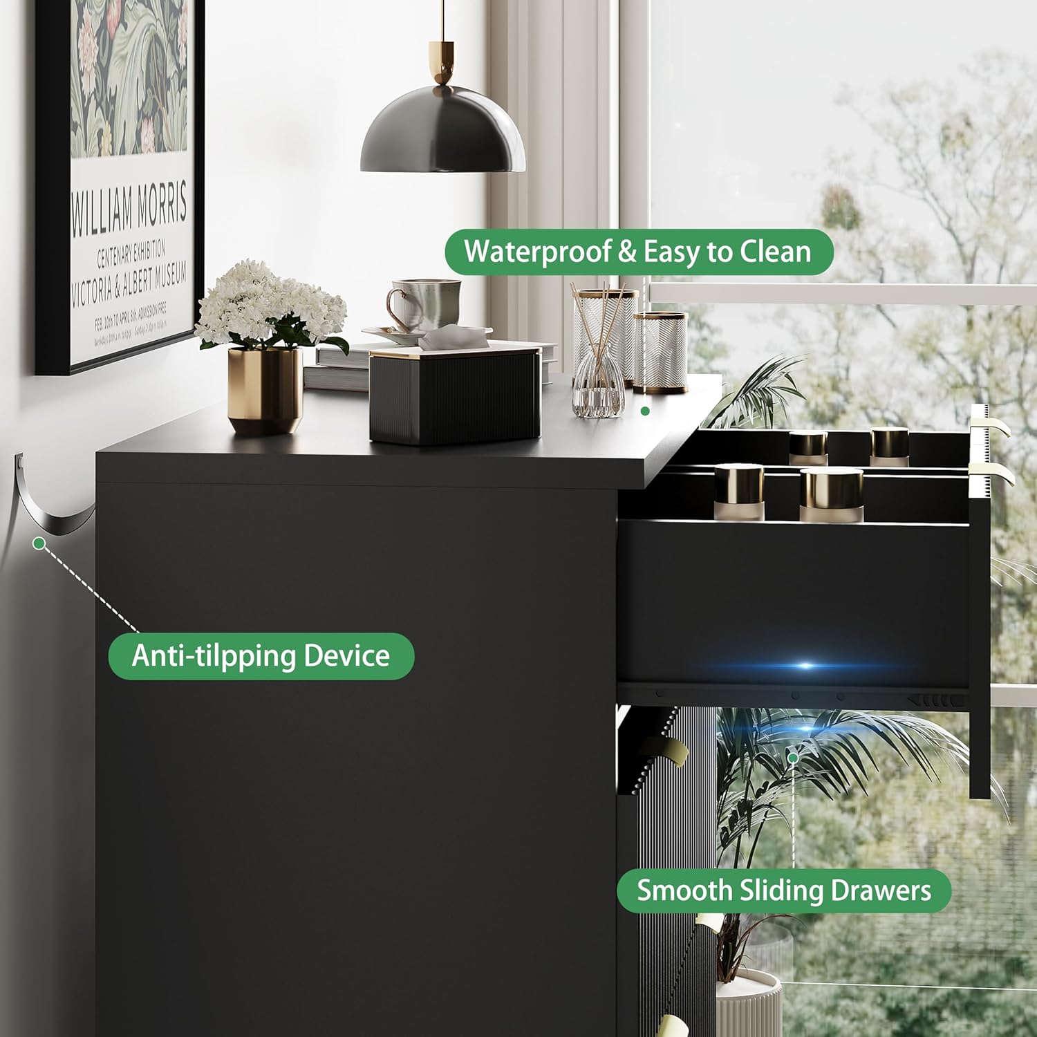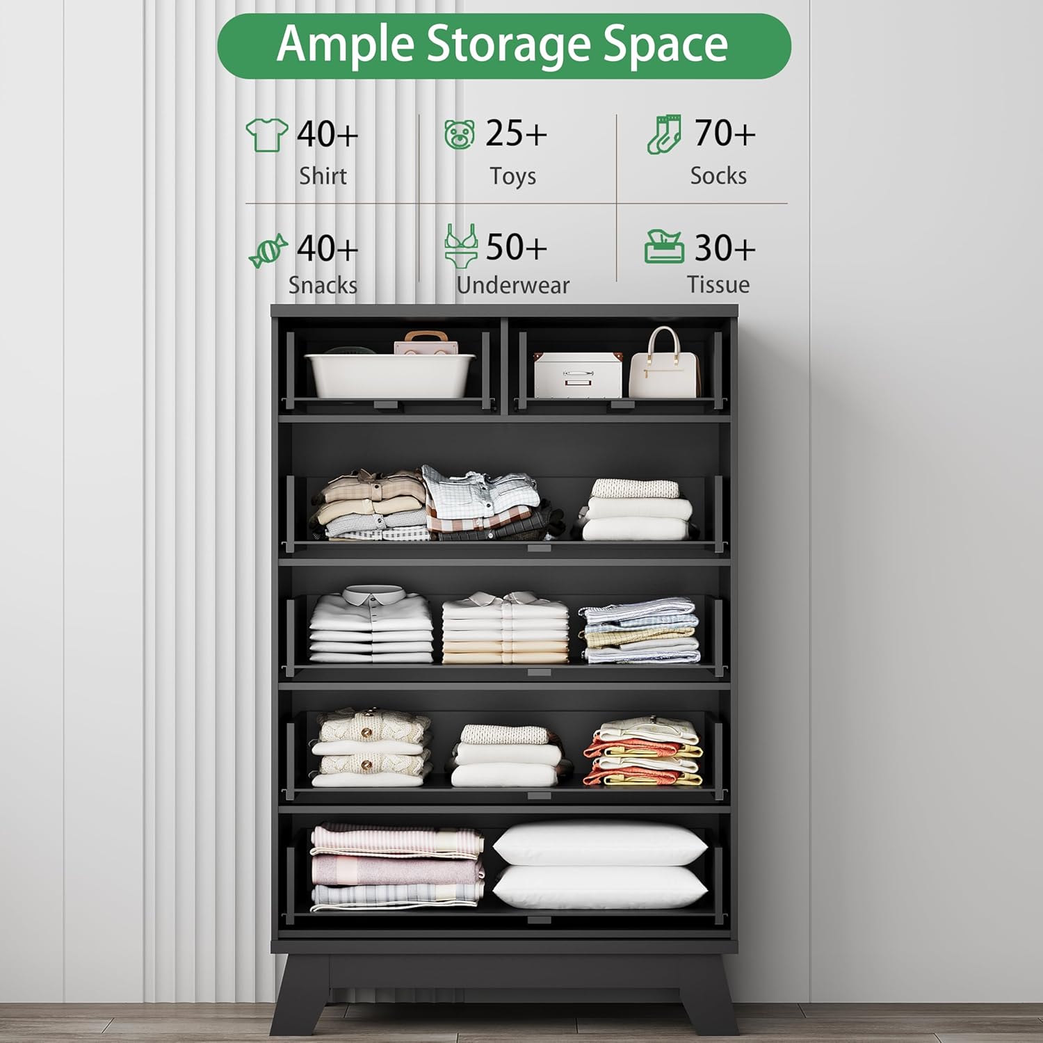 - 【Stability & Safety】The white/black/natural oak/grey dresser is equipped with an anti-tipping device, which can be fixed on the wall to prevent accidents. Each drawer contains a wide metal handle and built-in slide rail, easy to push and pull. Besides, the sturdy base provides this dresser with drawers a strong support and the middle feet can be adjustable to keep balance on uneven floors