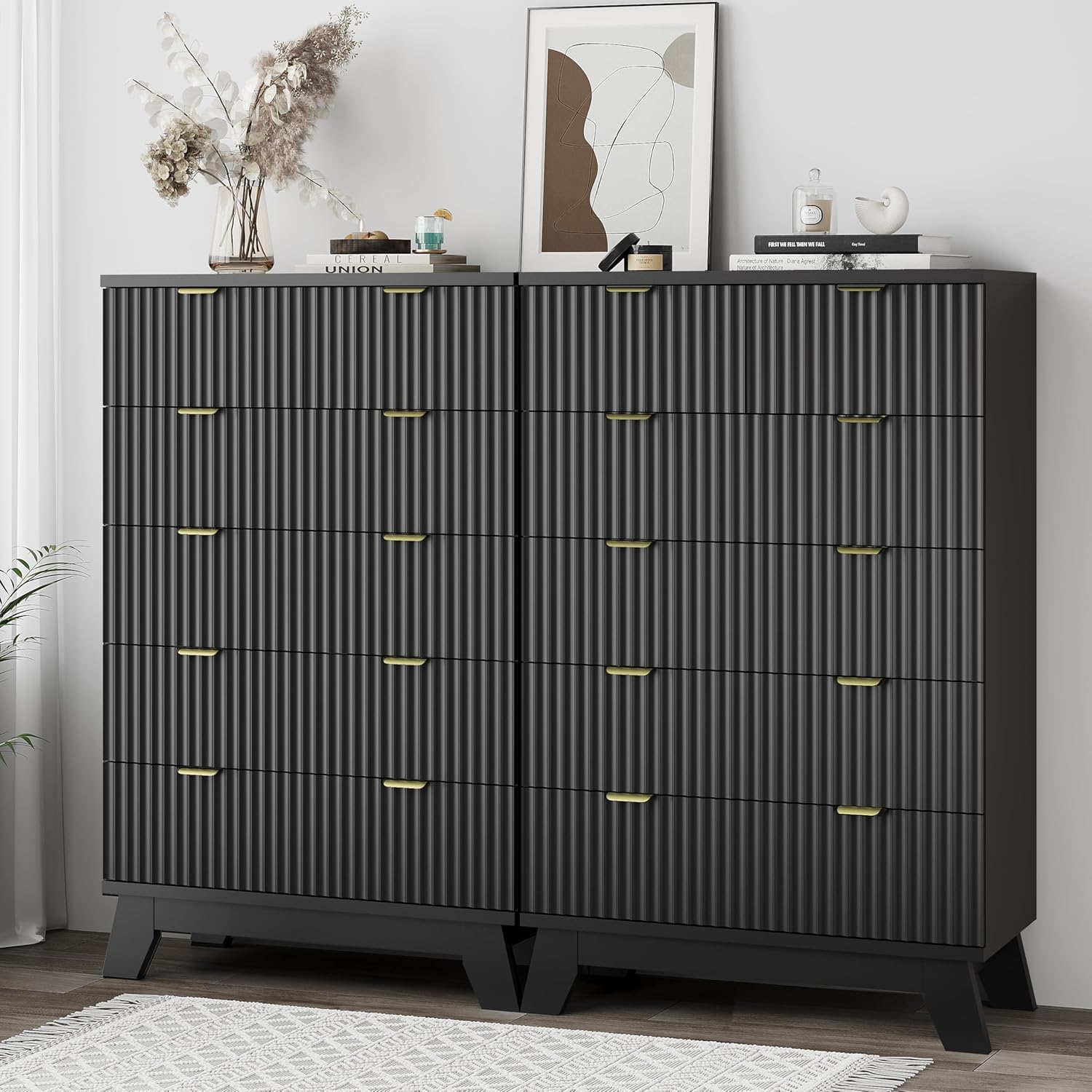 - 【Modern Chic Appearance】The unique wave-like fluted panel enhances the texture and elegance of this bedroom dresser. The thick table top features natural wood grain that complements the black finish. The wide metal handle and splayed base legs add a modern touch, creating a personalized and distinctive appearance
