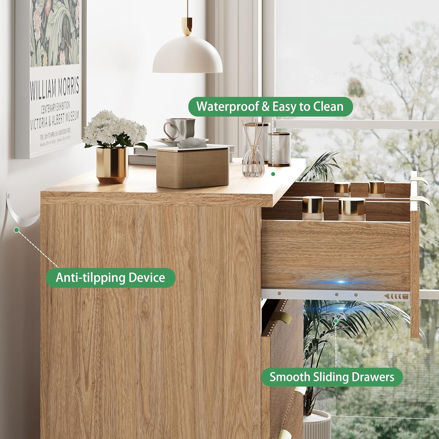- 【Modern Chic Appearance】The unique wave-like fluted panel enhances the texture and elegance of this bedroom dresser. The thick table top features natural wood grain that complements the natural oak finish. The wide metal handle and splayed base legs add a modern touch, creating a personalized and distinctive appearance