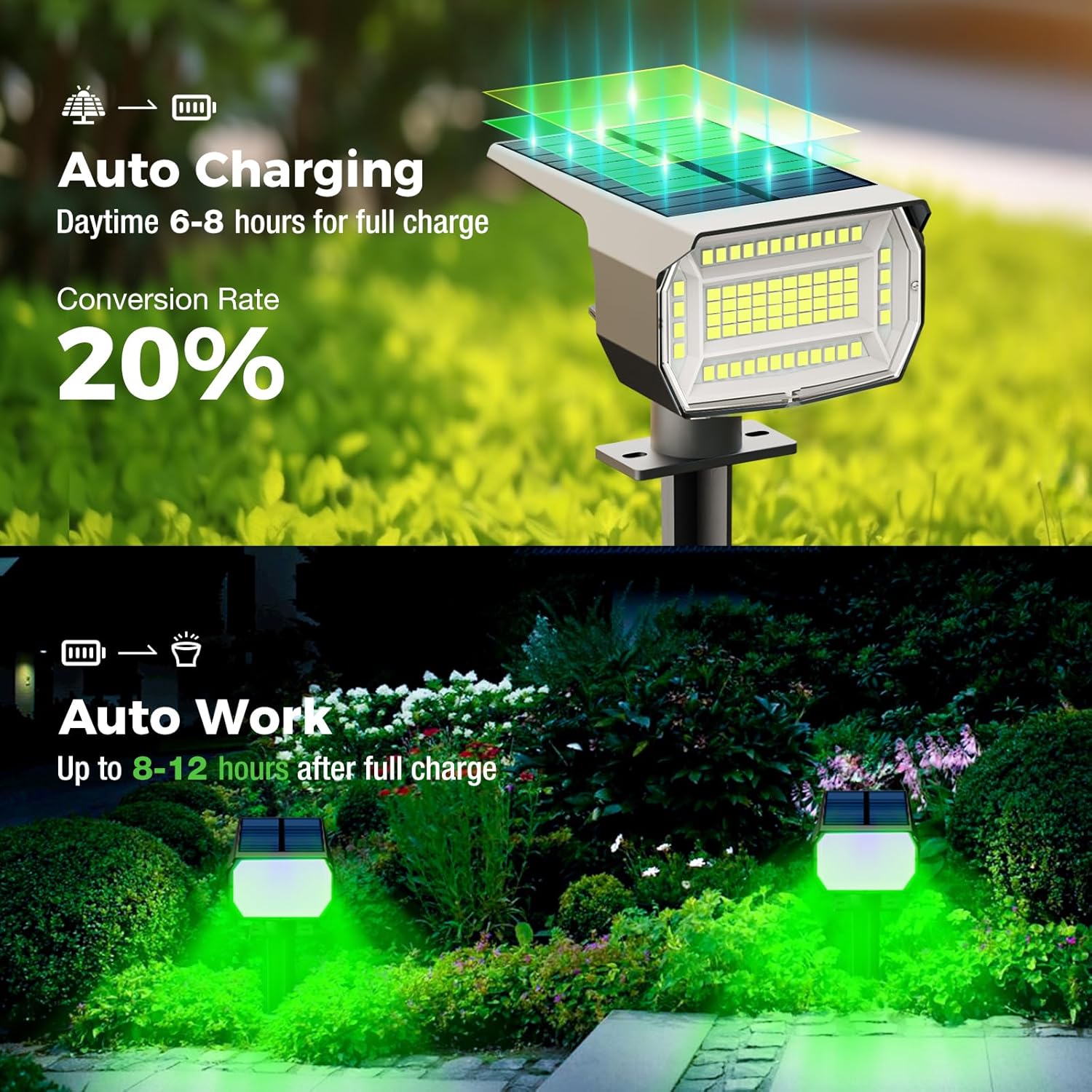 - Solar Powered & Energy Saving: The solar spotlight use solar energy to charge, which can automatically sense light, automatically turn on at night, and automatically charge during the day, saving electricity and reducing energy consumption