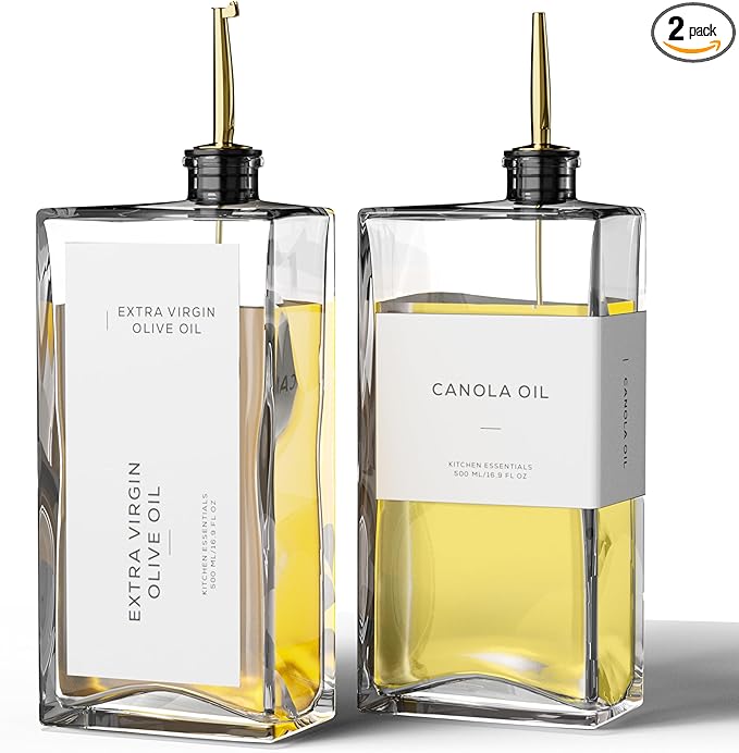 - Modern Kitchen Essential: Elegant and minimalist olive oil dispenser bottle include 2 high-quality 16.9 oz (500 ml) glass bottles, 2 weighted self-closing spouts, 2 Silicone Dust-Proof Oil Spouts, 1 funnel and a set of 40 labels, making them a must-have for any kitchen. Practical and decorative for your kitchen counter, these cooking oil dispenser meet all your kitchen needs for style and functionality!
