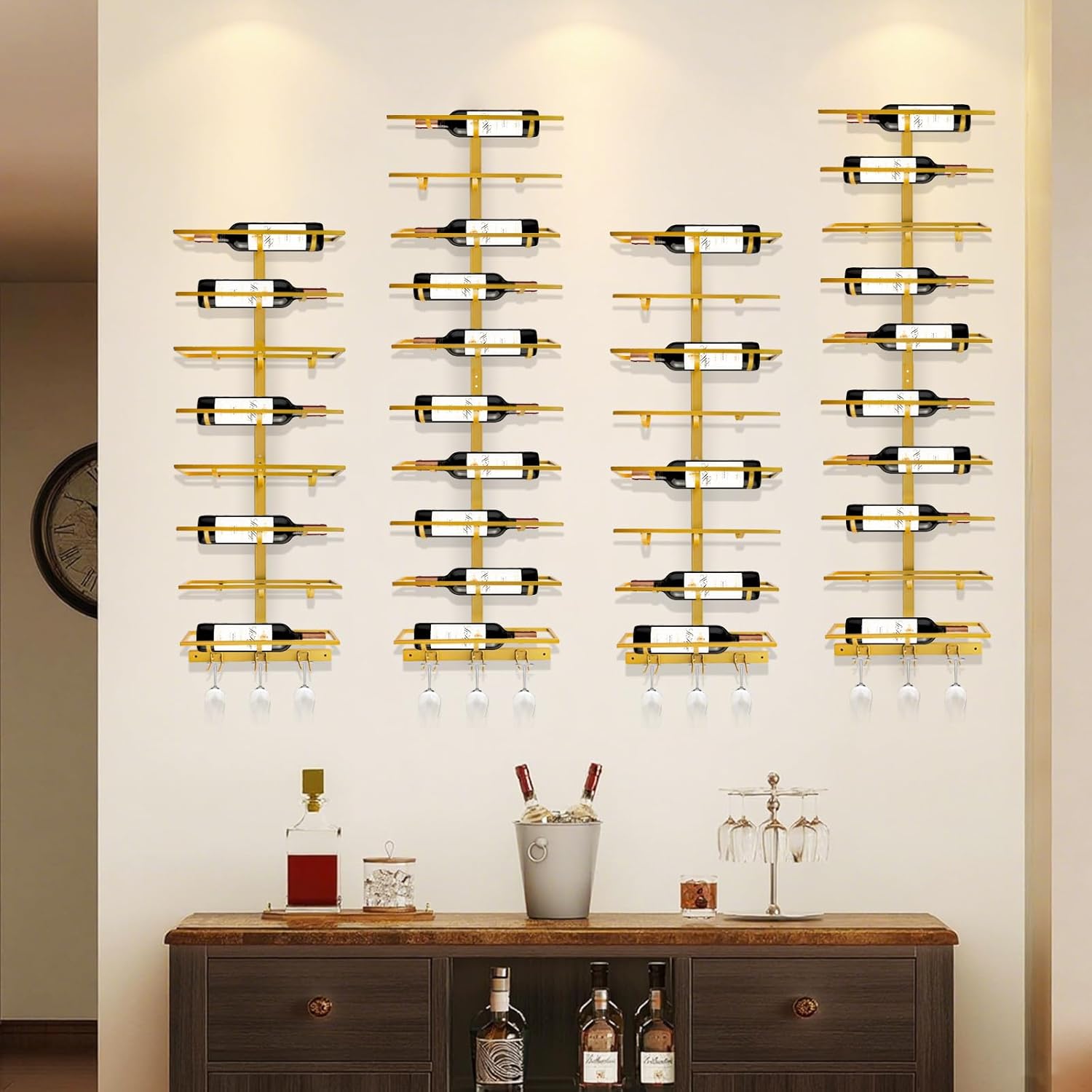 8 Bottle Wall Mount Wine Rack with Wine Glass Holder, Metal Wine Wall Rack, Wall Racks for Wine Bottles Display and Storage, Hanging Bottle Organizer for Living Dining Room Wine Cellar Bar (Gold)
