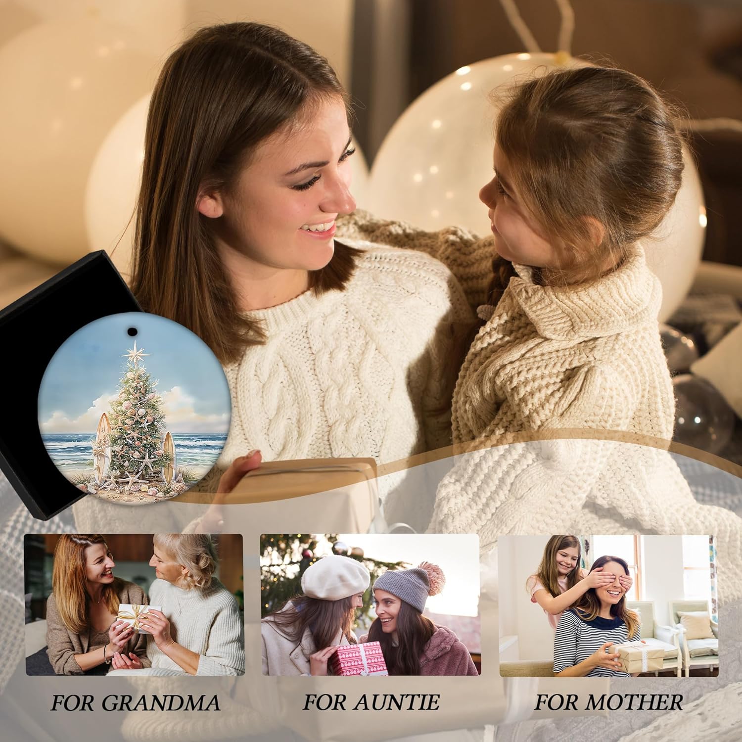 Coastal Beach Christmas Ceramic Ornament Gifts, Ocean Beachy Seashell Christmas Decorative Hanging Ornaments for Xmas Tree Holiday Party Decoration, Coastal Beach Xmas Tree Decorations