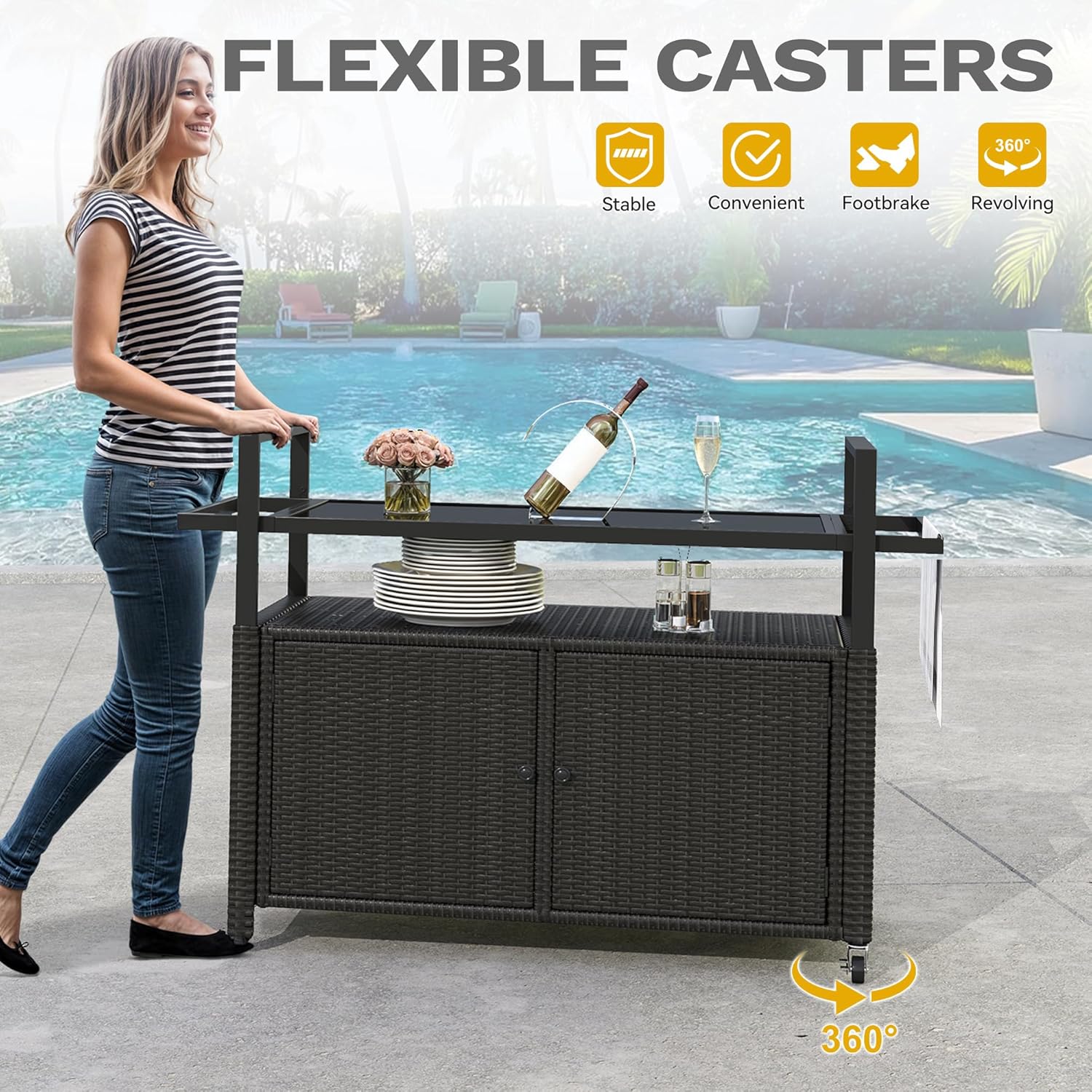 DWVO Patio Bar Table,Outdoor Kitchen Island with Glass Top,Rattan Patio Storage Cabinet with Wheels,Bar Cart for Poolside and Backyard,Black