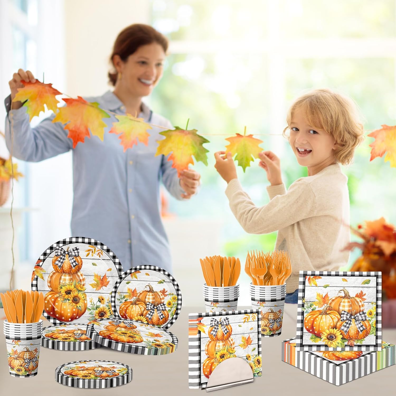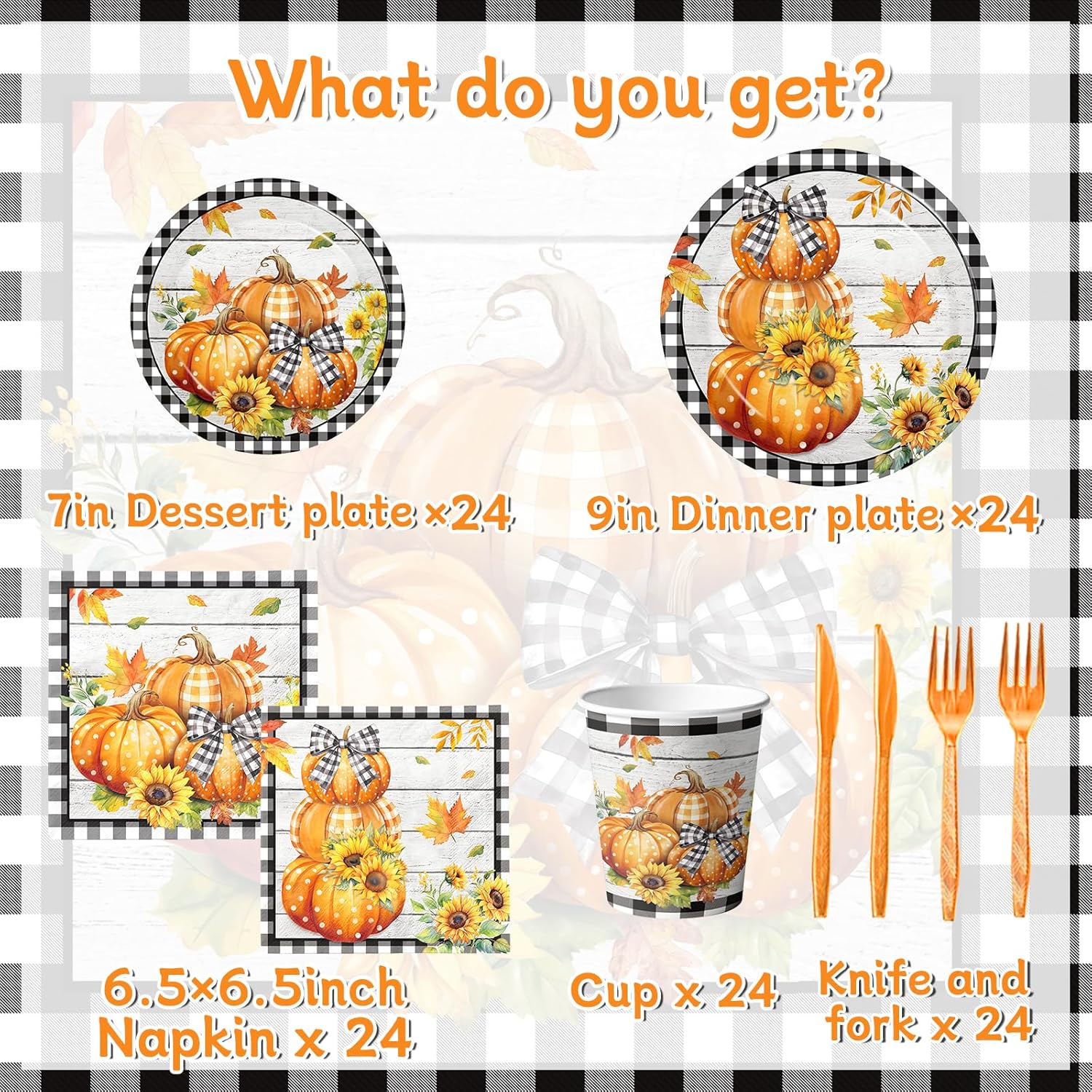 - 【PUMPKIN THEME】This pumpkin tableware is designed with an autumn theme and a black Buffalo Plaid pattern, featuring pumpkin, maple leaves, sunflowers, and bow. The colors are bright and the design is exquisite. The overall style is perfect for pairing with autumn parties, adding a seasonal atmosphere to your dining table!