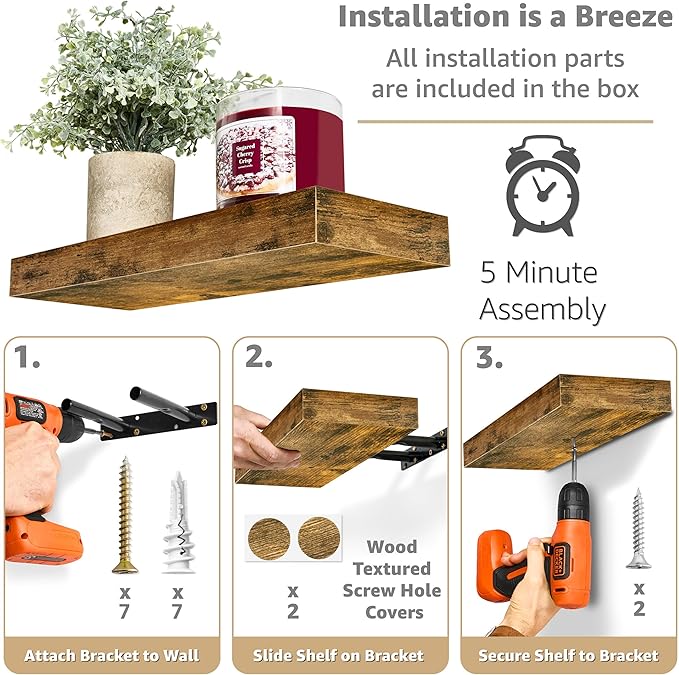 - Easy Installation: Mounting hardware INCLUDED the Hanging shelves are made of beautiful MDF with PVC + Bracket - Sturdy enough to arrange and display your favorite small objects - Attaches firmly to the wall without visible support - Minor assembly required - Supports up to 22 pounds per shelf - Measures approximately 16.25 inch L x 5.50 inch W - Each display shelf 1.5 inch thick