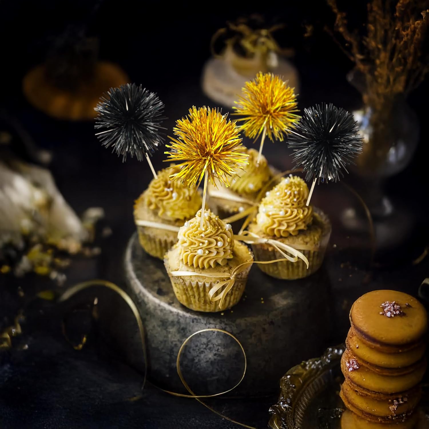 Ephlyn 30Pcs Foil Firework Cupcake Toppers Sparkle Tinsel Cupcake Picks Happy Birthday Cake Decorations Drink Stirrers Cocktail Food Toothpicks for Baby Shower Graduation Party Supplies Black Gold
