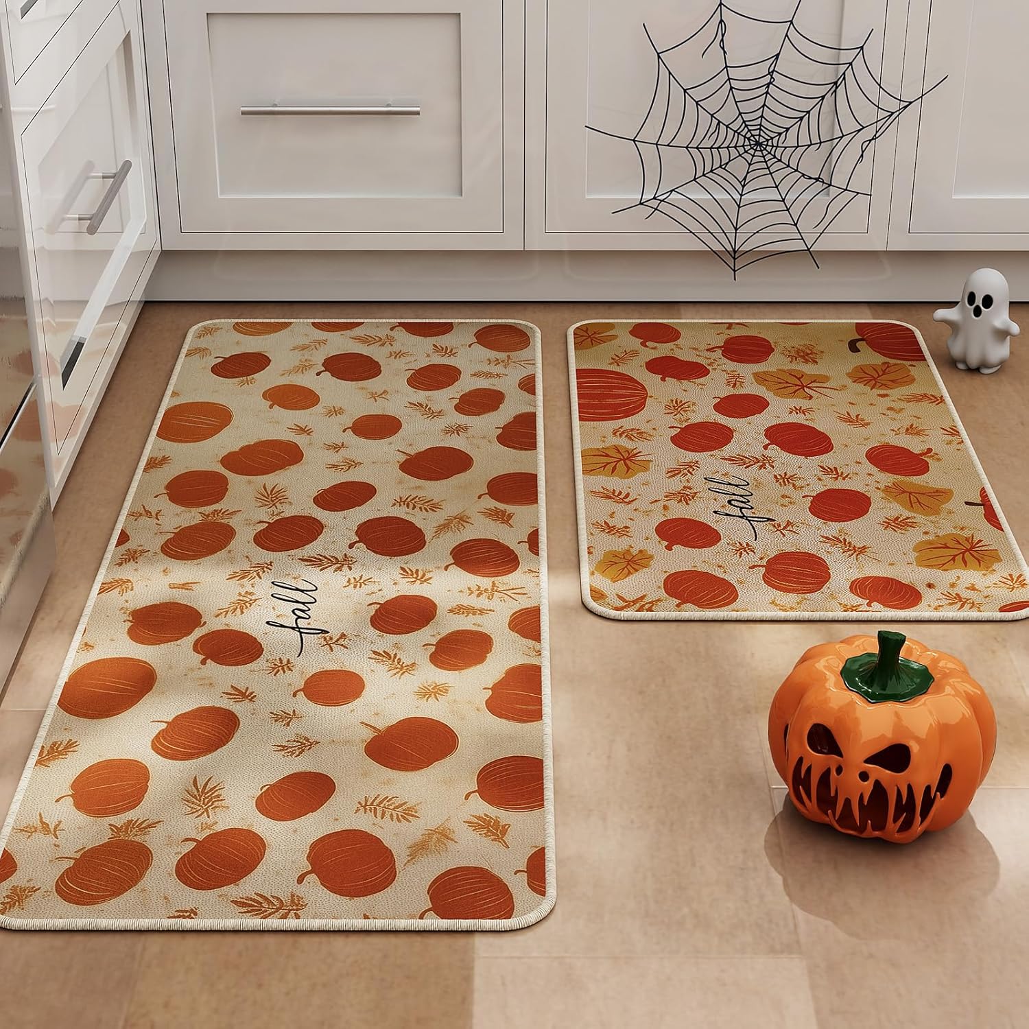 Halloween Kitchen Mat Set of 2, Pumpkin Kitchen Halloween Decor, Fall Decorations for Home, Halloween Rug for Floor,Indoor Home Decor with Non-Slip Backing,17 x 29 Inch & 17 x 47 Inch
