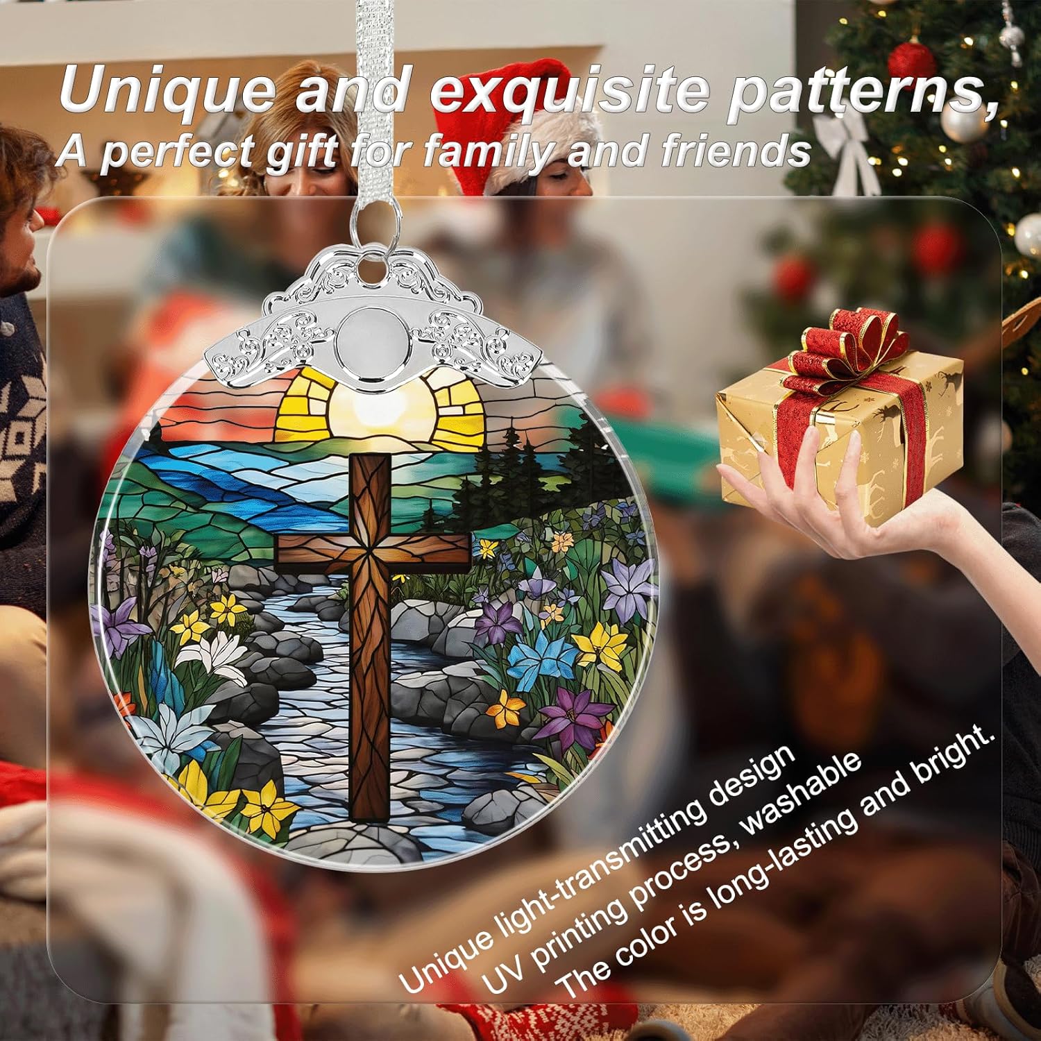 Cross Stained Glass Religious Christmas Ornament, Hanging Ornaments for Christmas Tree Decorations, Christian Gifts Holiday Keepsake Present Exchange Idea