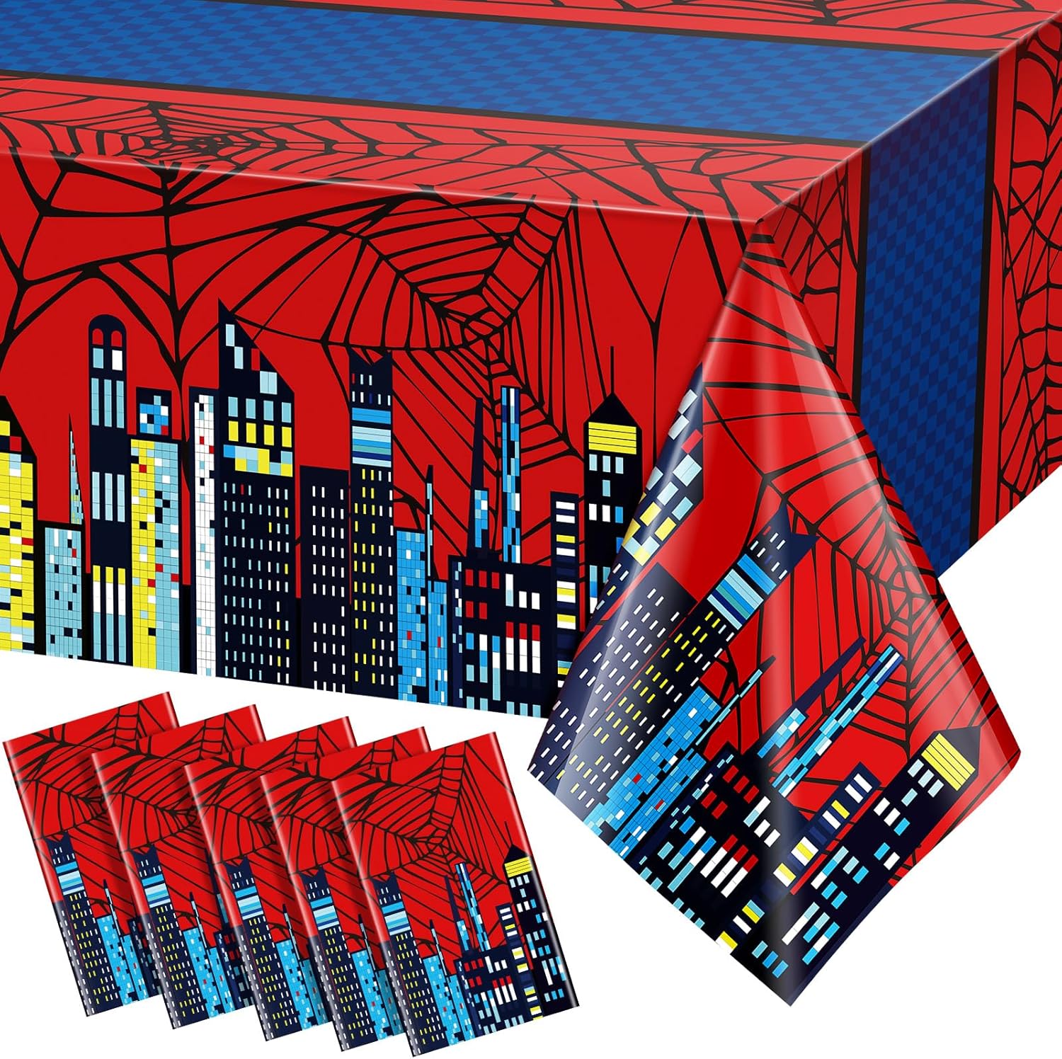 Oudain 5 Pcs Spider Tablecloth 108 x 54 in Red and Blue Plastic Disposable Table Covers City Web Theme Birthday Party Decorations Large Table Cloths for Party Indoor Outdoor (Classic)