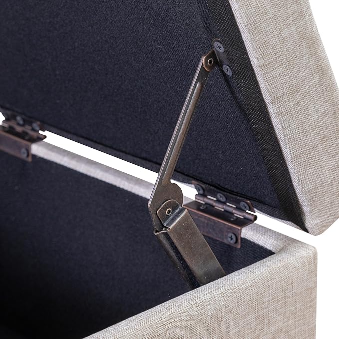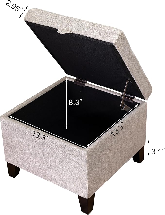 Adeco 18 Inch High Cube Ottoman Storage, Linen Chair Foot Stools, Upholstered Vanity Stool with Hinged Lid, Solid Wood Legs (Beige Grey)