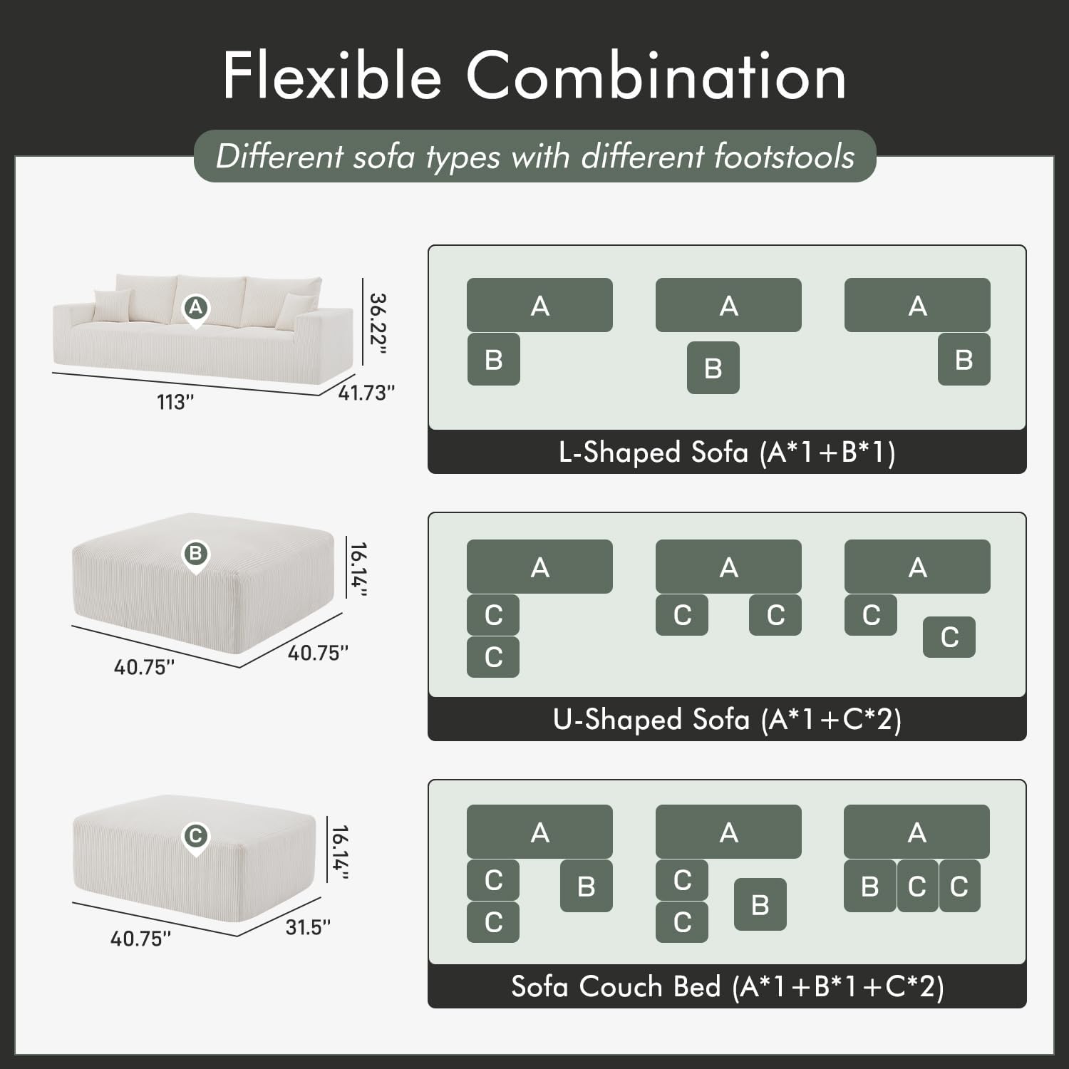 Boneless Sectional Cloud Couch Sofa Bed for Living Room, 112" Modular Modern Lounge 3 Seater Sleeper Beige Couches with Chaise, No Assemble, Cordury Compression Upholstered Sofas