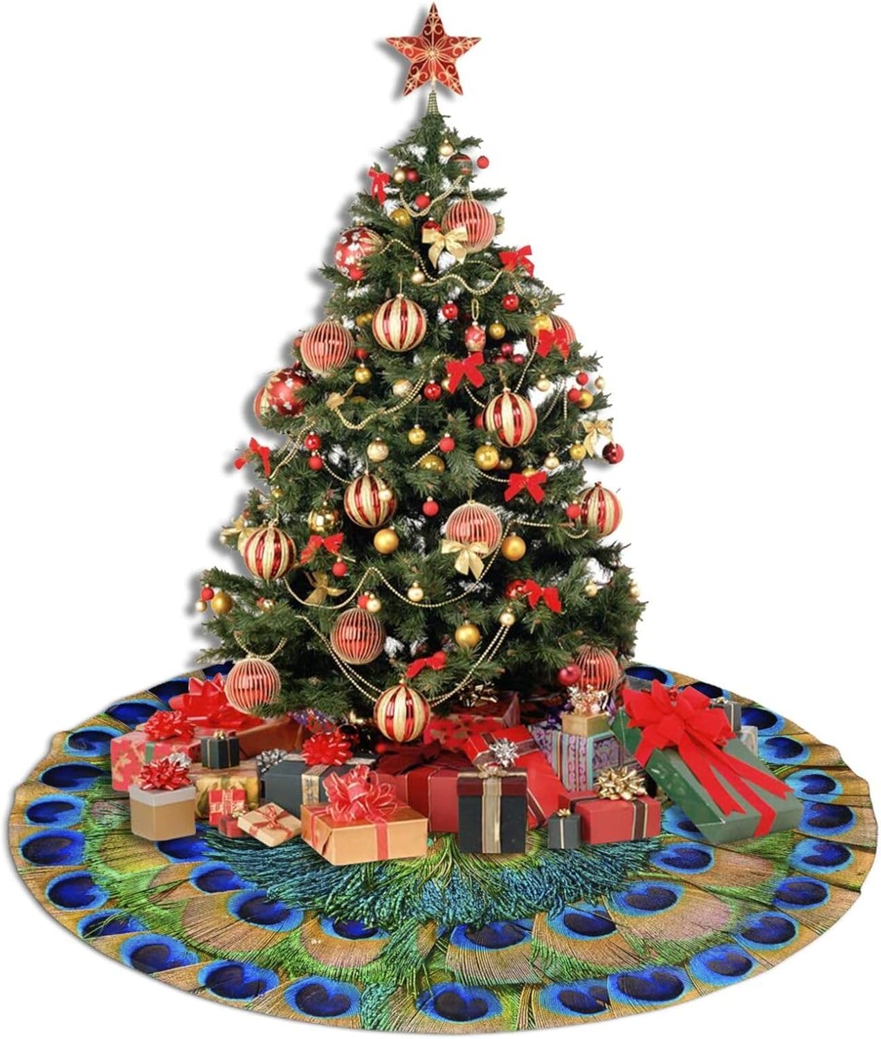 Christmas Tree Skirt,Peacock Feathers Circle Xmas Tree Skirt Rustic Farmhouse Tree Skirt for Christmas Decor Xmas Holiday Home Party Decorations30