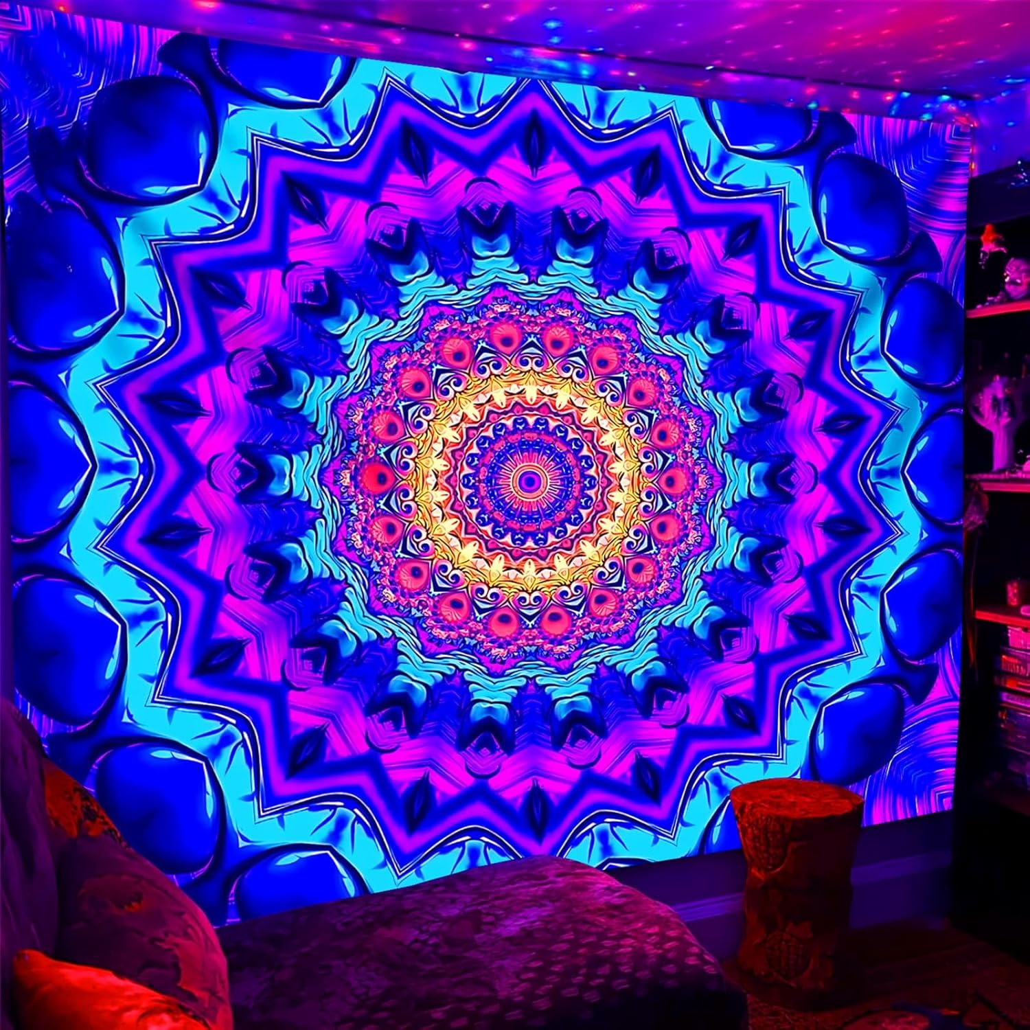 Blacklight Mandala Tapestry for Bedroom, Black Light Posters for Adults and Teens, Colorful UV Reactive Aesthetic Bohemian Wall Art Decor (90 x 70 Inches)