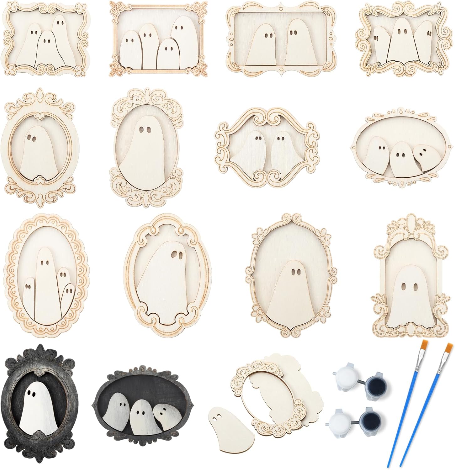 12 Set Wood Ghost DIY Frames Decorating Craft with Paint and Brush Unfinished Wooden Gift Ornaments Cute Ghost for Halloween Craft Art Party Supplies, Not Include Glue (Cute Style)