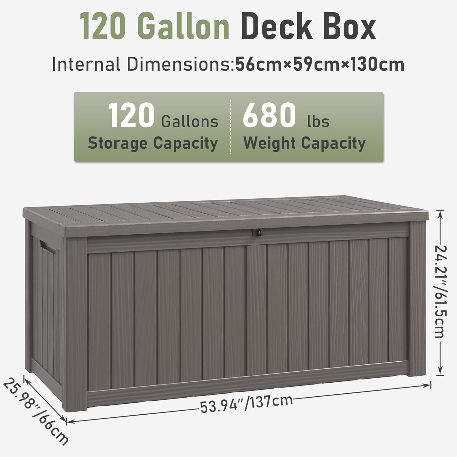 - Immense Storage Capacity: With dimensions of 53.9in x 25.98in x 24.21in, this deck box offers perfect storage space for all your outdoor essentials. It can hold up to 120 gallons of garden tools, pool supplies, patio furniture, cushions, and more.