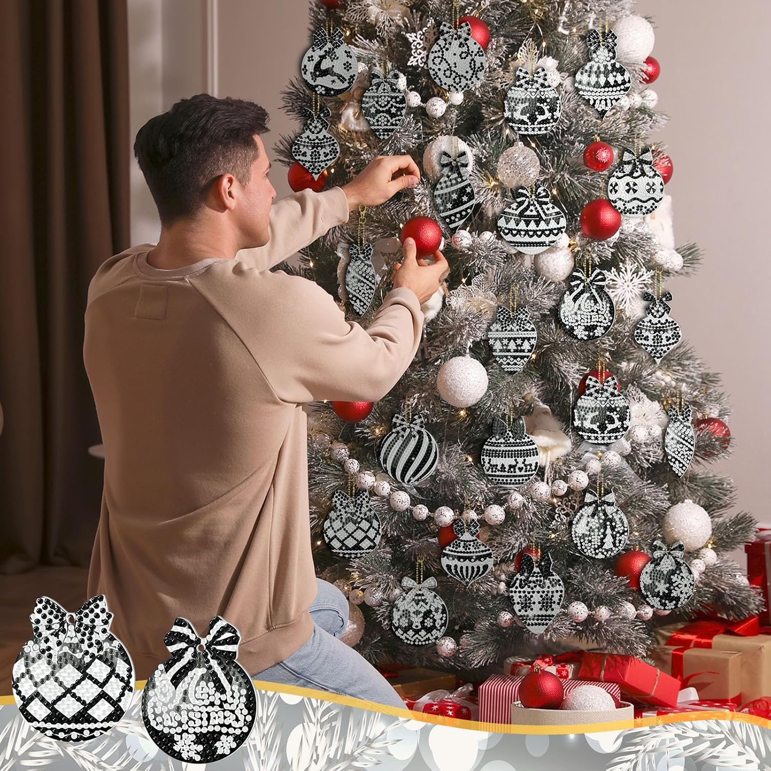 - Black and White Christmas Balls Themed Design: our Christmas diamond art keychains are cute and attractive, which is attractive to black and white lovers; These keychains with rhinestones will catch the eye and add the atmosphere of the Christmas