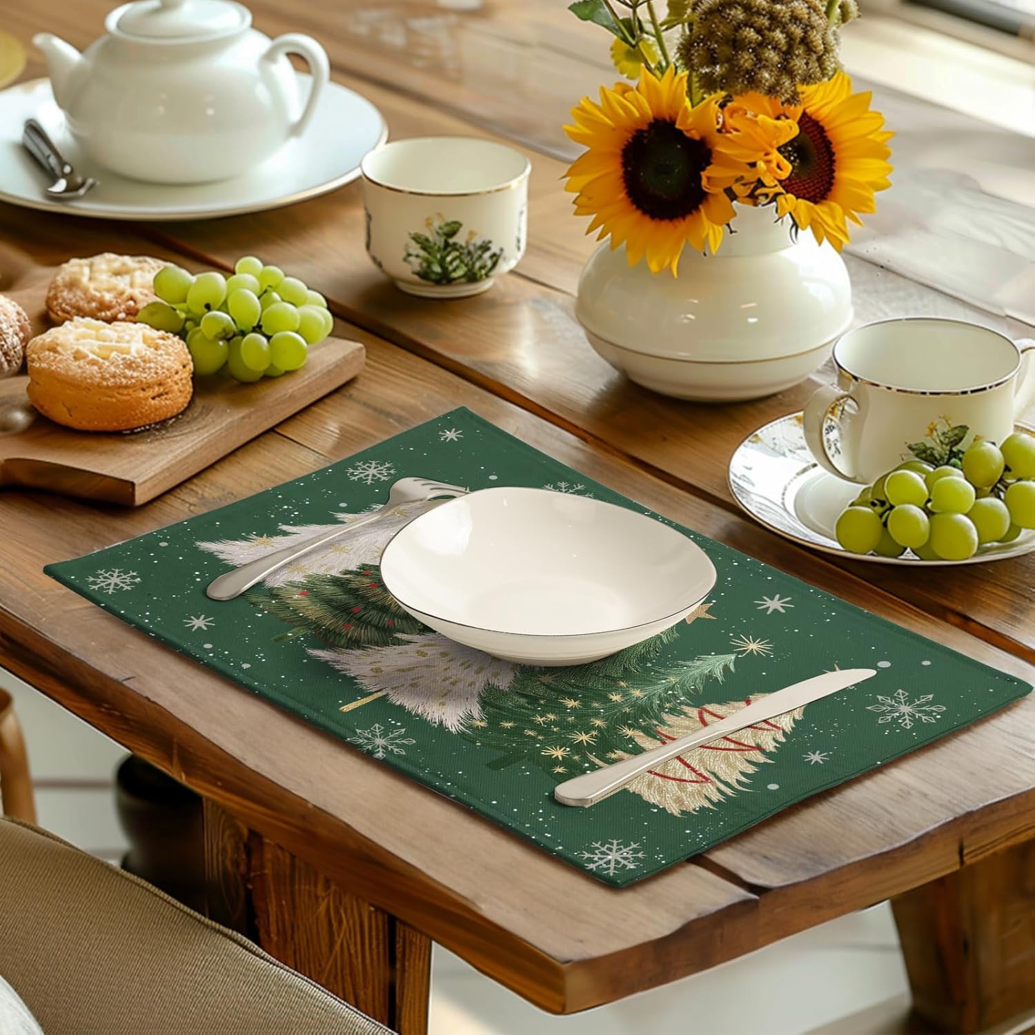 Green Christmas Tree Placemats Set of 4, 12x18 Inch Xmas Trees Snowflakes Winter Holiday Place Mats Seasonal Washable Linen Table Mats for Indoor Outdoor Kitchen Dining Party Décor
