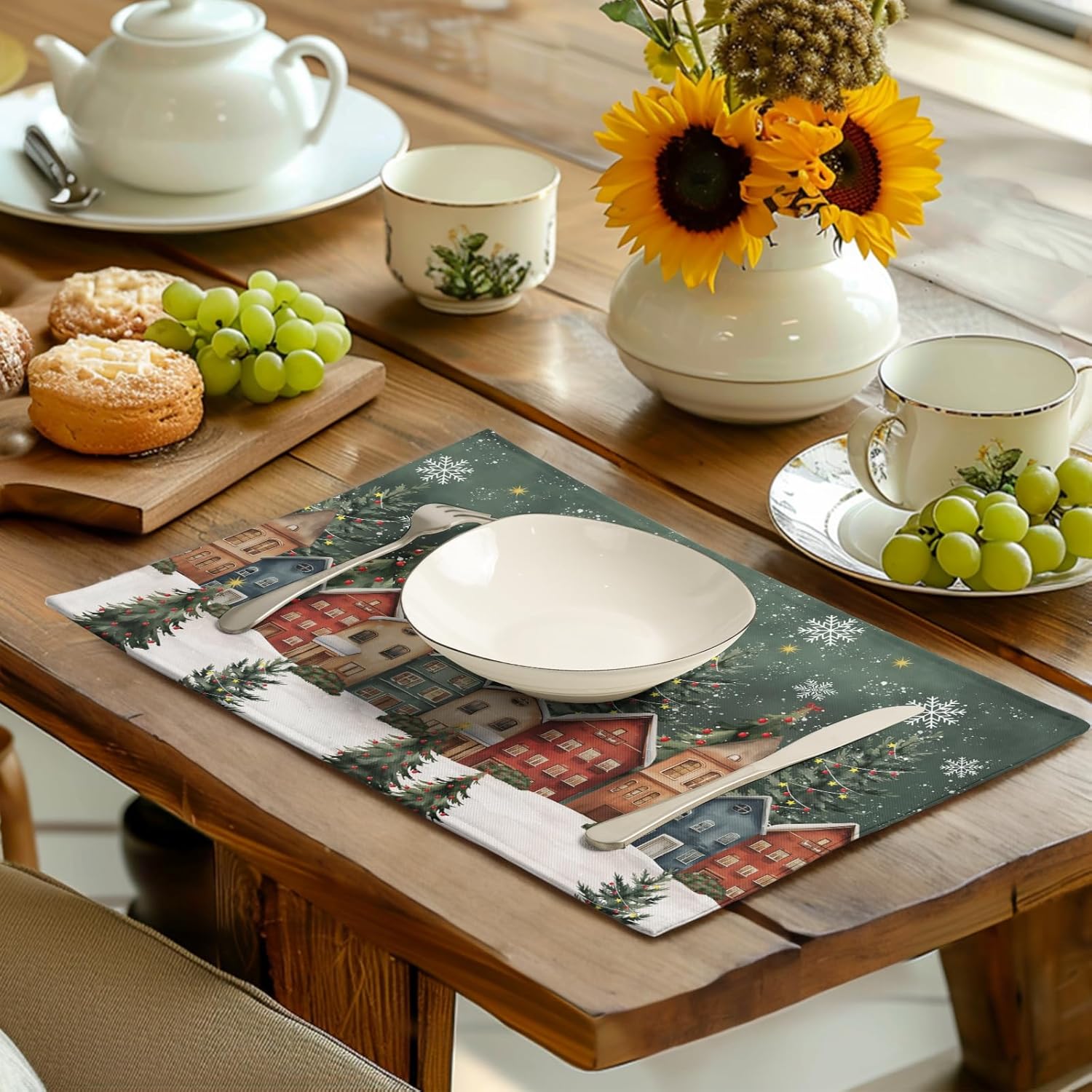 - TABLE DECORATION: Christmas holiday placemats feature high-definition printing technology for crisp, clear patterns and vibrant colors; rectangle placemats with a xmas village pattern; unique and eye-catching seasonal patterns add charm to farmhouse table place mats, creating a winter and Christmas atmosphere for your party