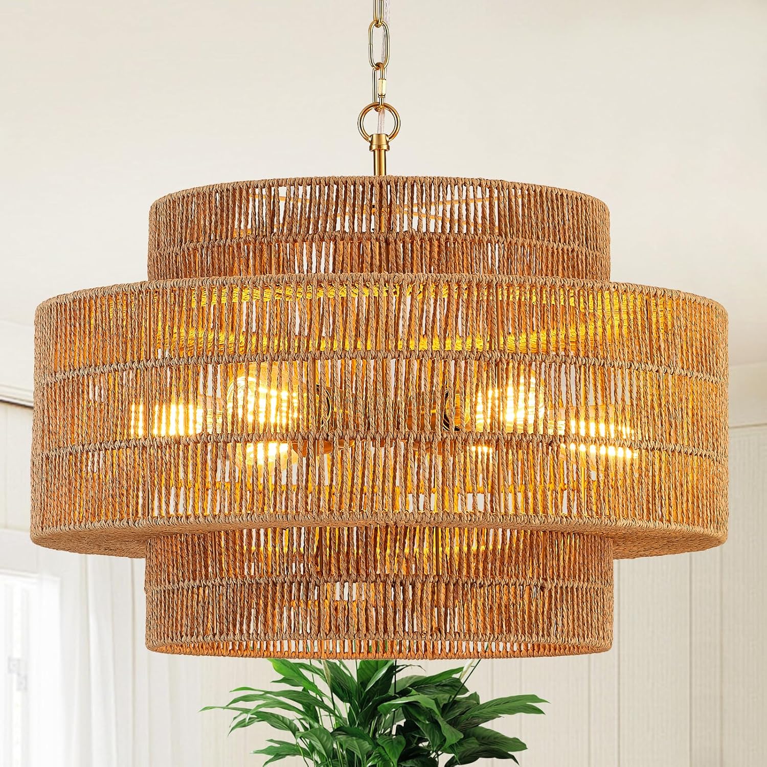 23.6" Rattan Chandelier Light Fixture 6-Light Vintage Farmhouse Hand-Woven Boho Bamboo Rattan Chandelier 3-Tier Drum Wicker Gold Chandeliers for Dining Room, Kitchen, Living Room