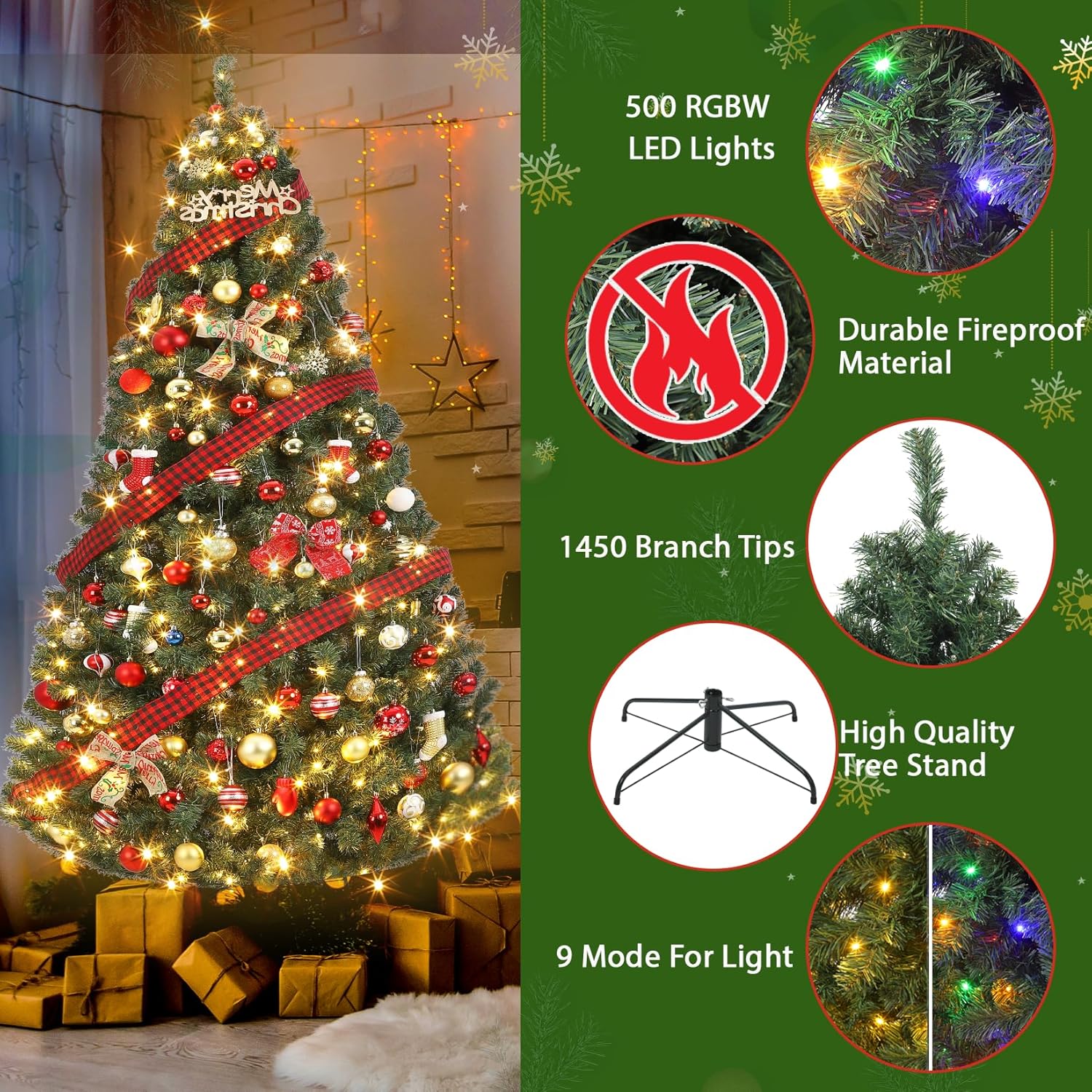 - PRE-LIT WITH 8 LIGHTING MODES & FOOT PEDAL CONTROL: Enjoy customizable holiday lighting with 600 energy-efficient LEDs offering both warm white (3000K) and multicolor options. Easily switch between 9 modes: Steady Multicolor, Flashing Multicolor, Slow Fade Multicolor, Steady Warm White, Flashing Warm White, Slow Fade Warm White, Flashing RGBW, and Slow Fade RGBW, Conbination.