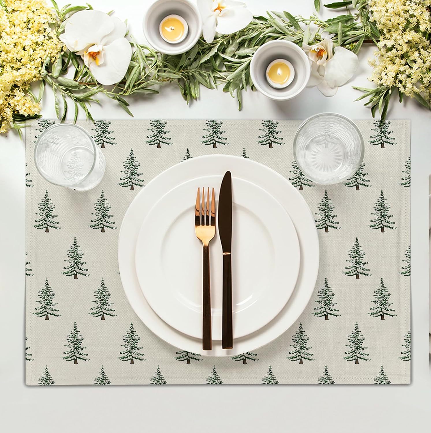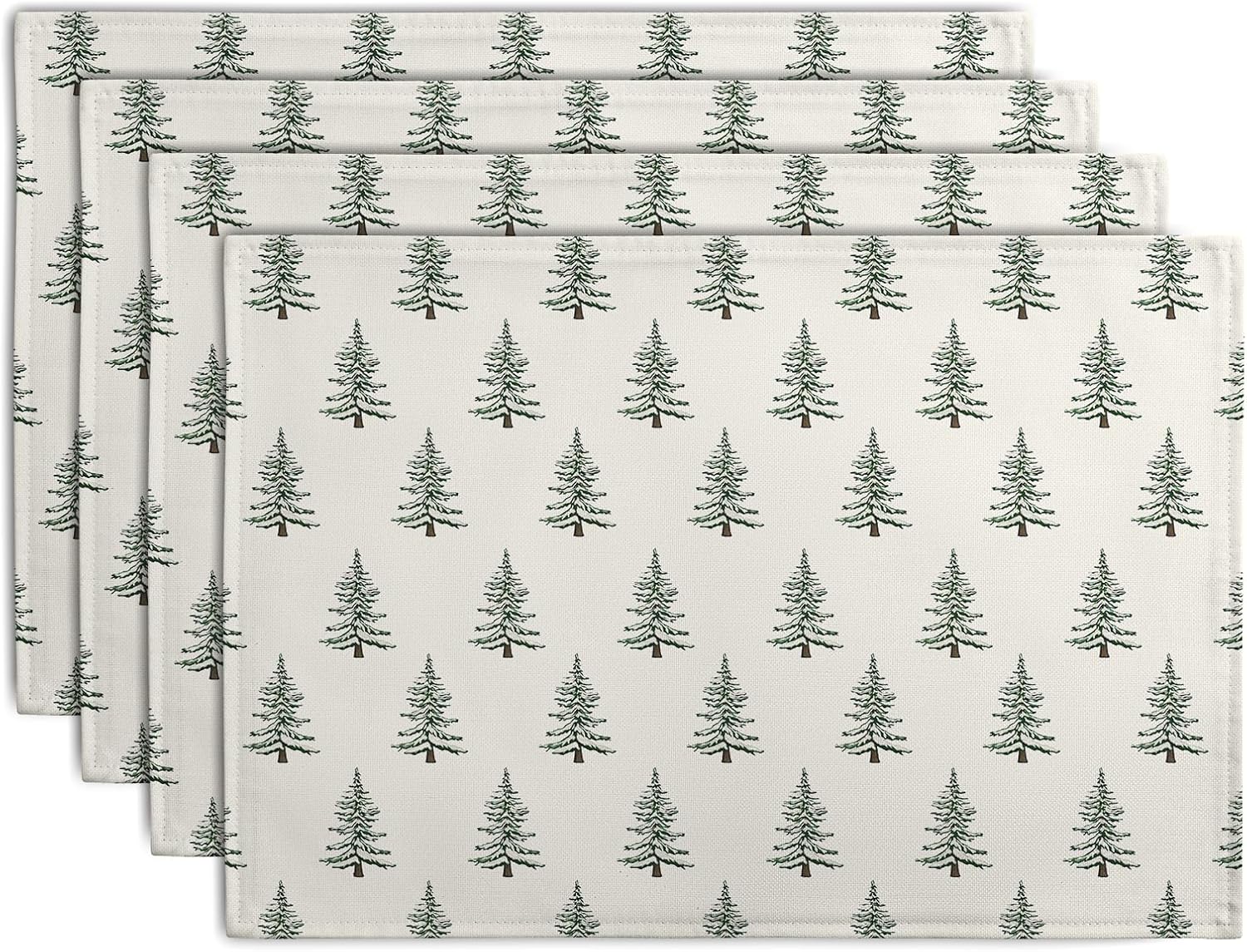 Pine Trees Christmas Placemats Set of 4 Xmas Tree Vintage Rustic Print Place Mats Winter Holiday Green White Farmhouse Linen Table Mats for Indoor Outdoor Kitchen Dining Party Decor