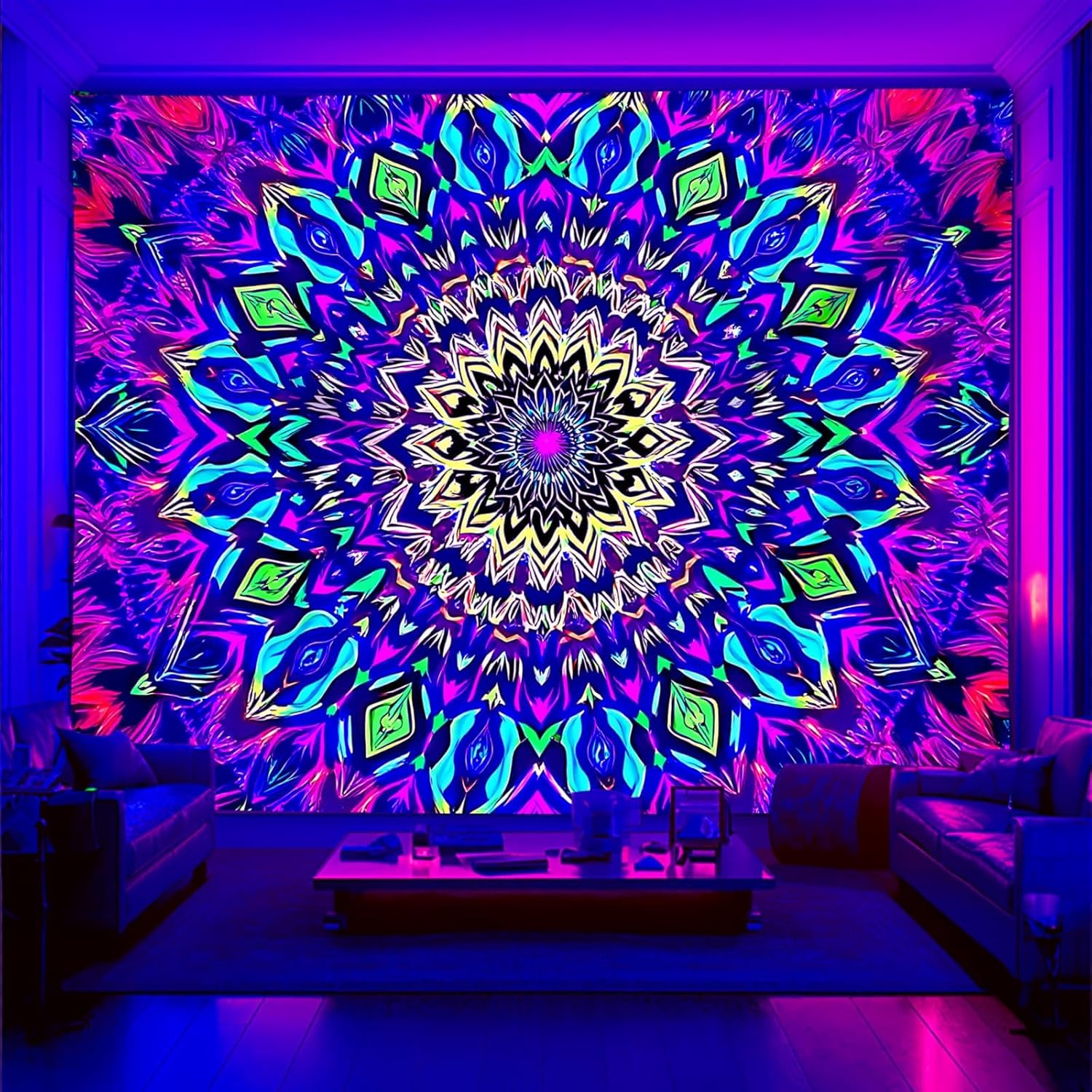 Blacklight Mandala Tapestry for Bedroom, Large Black Light Posters for Adults and Teens, Colorful UV Reactive Aesthetic Bohemian Wall Art Decor (80 x 60 Inches)