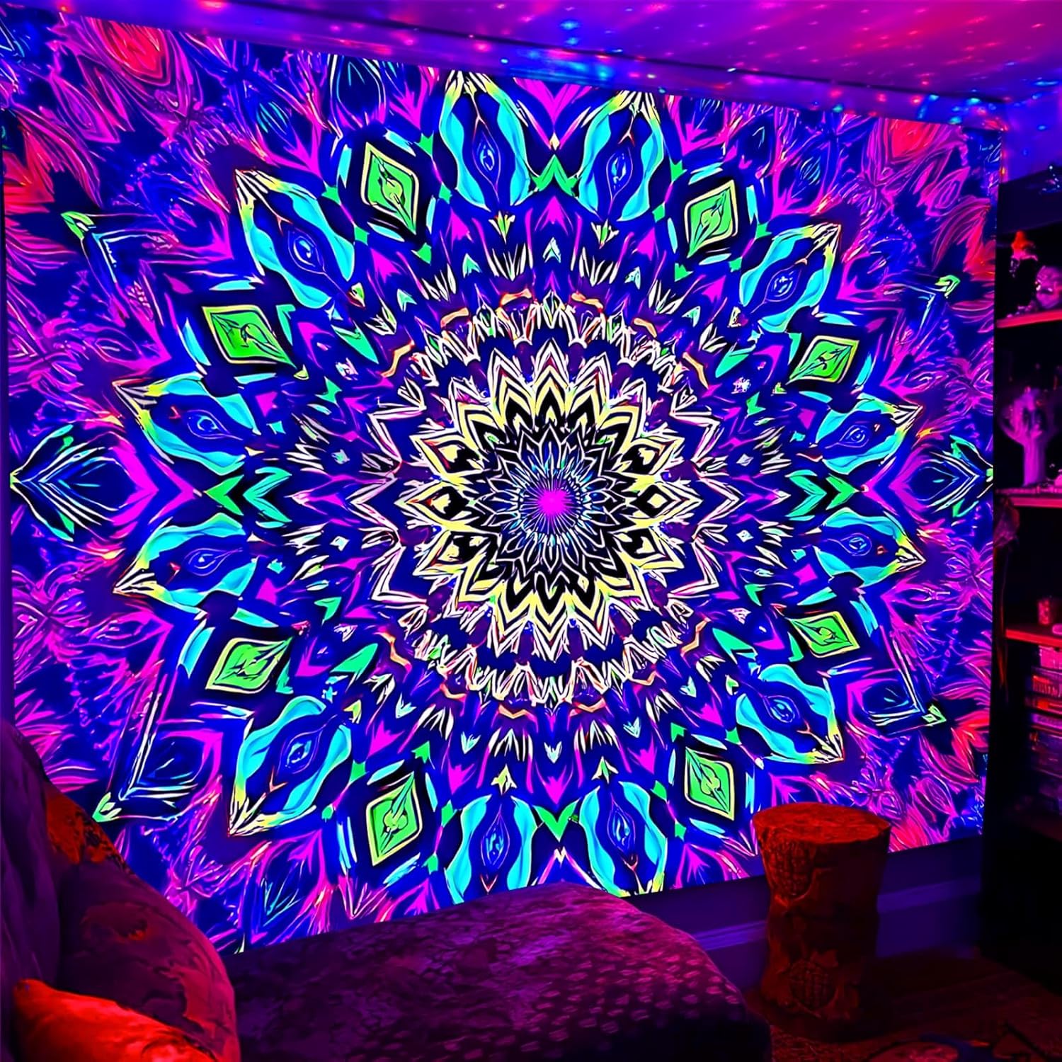 Blacklight Mandala Tapestry for Bedroom, Black Light Posters for Adults and Teens, Colorful UV Reactive Aesthetic Bohemian Wall Art Decor (40 x 30 Inches)