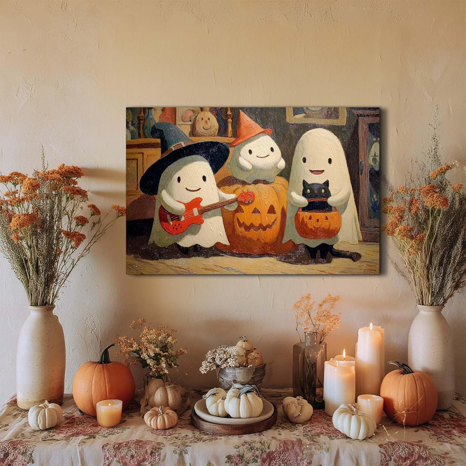 - This cute ghost canvas captures the joy of autumn's arrival. Bring this cute ghost canvas wall art into your home, and it will add a unique touch of color to your living space