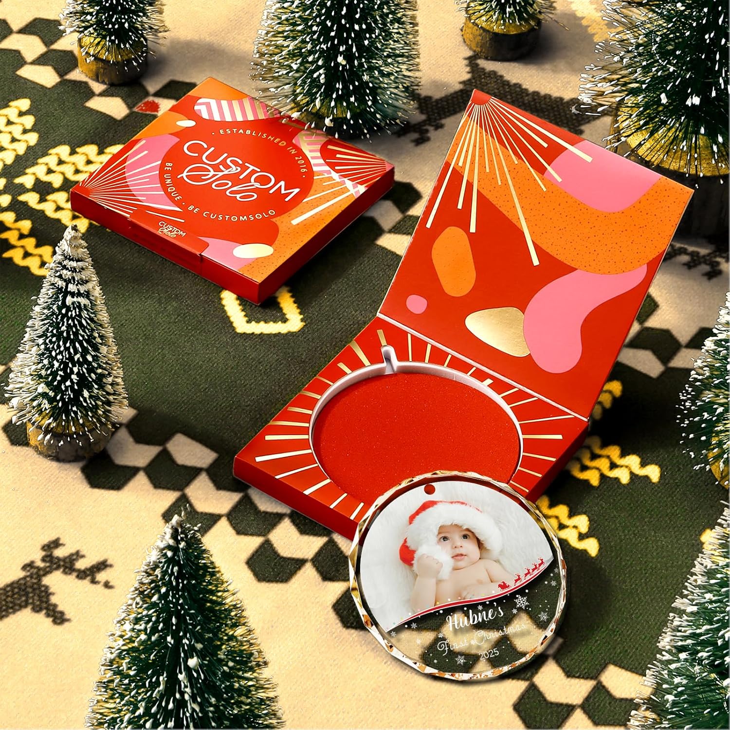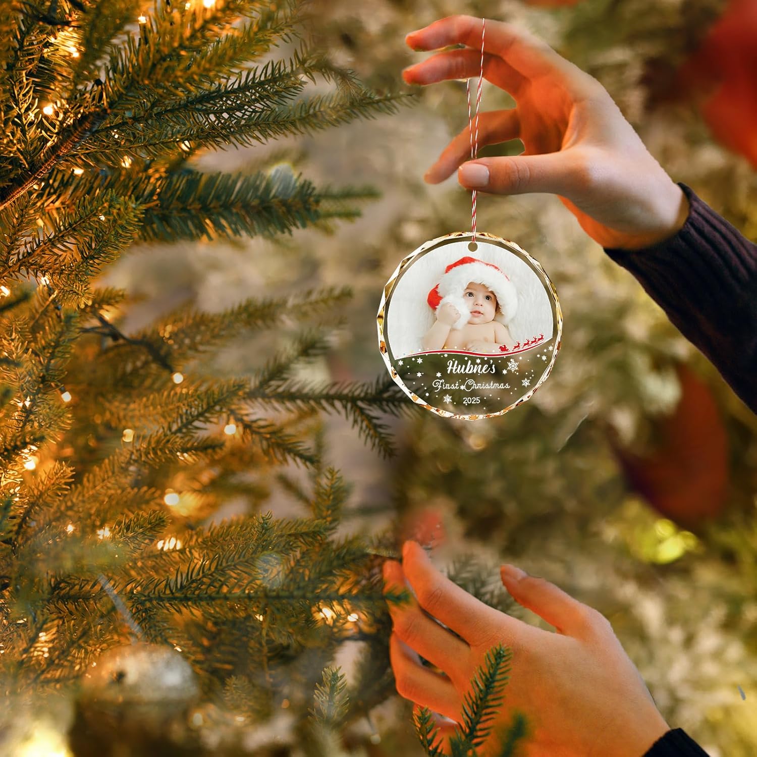 - 💎 Personalized Crystal Ornament – Crafted from premium clear crystal, this ornament allows you to upload your baby’s photo and add their name or birth year. A timeless keepsake to celebrate your little one’s very first Christmas